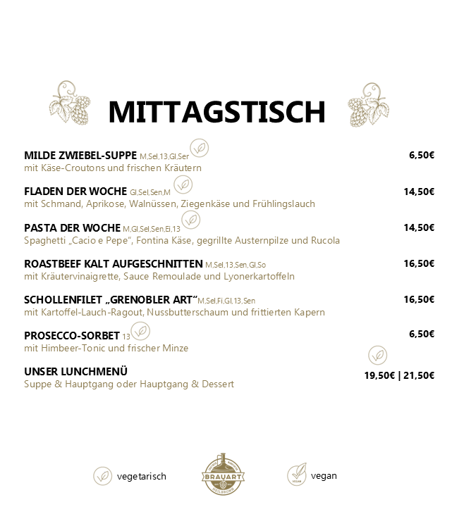 Es erwartet Sie ein Mittagstisch von 11:30 - 14:00 Uhr mit wöchentlich wechselnden Gerichten oder wählen Sie alternativ aus unserer regulären Mittagskarte von 11:30 - 17:15 Uhr